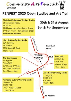 Christine Finlayson’s studio will not be open this weekend due to illness. Please check the Community Arts Website (www.penicuikarts.org) for updates.